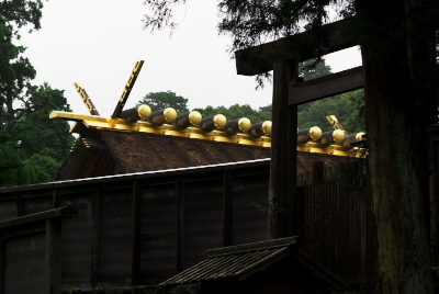 ようやく本宮へ。本宮は非公開なので塀越しに眺めます。いままで白黒写真の建築史資料しか見たことがなたったので、金箔で装飾されているとは知りませんでした。